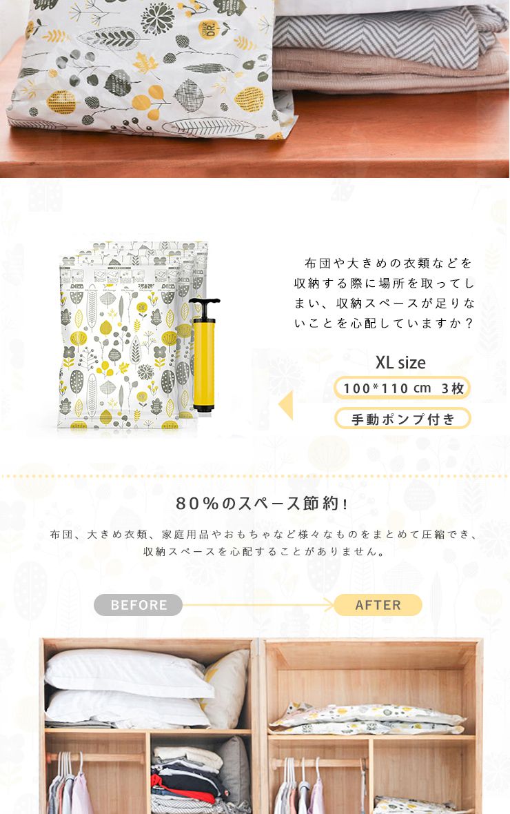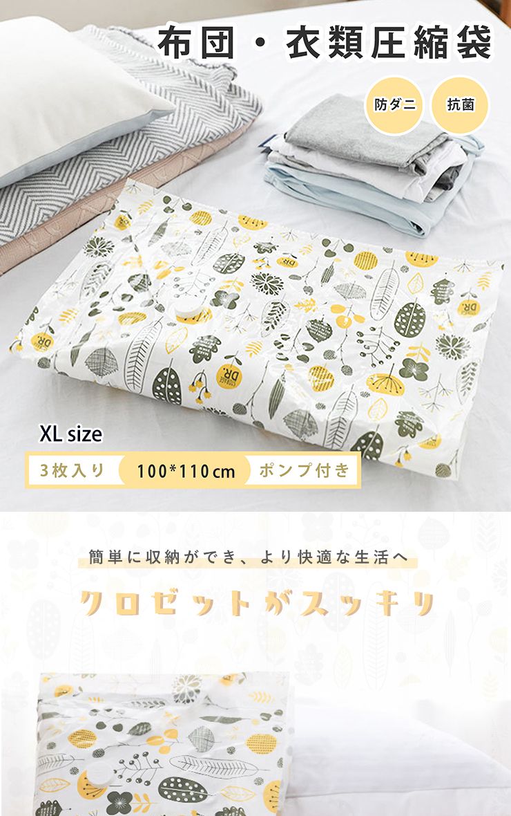 圧縮袋 ふとん 衣類 敷布団収納可 XL 3枚入り ポンプ付き セット 防ダニ 抗菌 【110cm×100cm 】 布団圧縮袋 防塵防湿 カビ【送料無料】