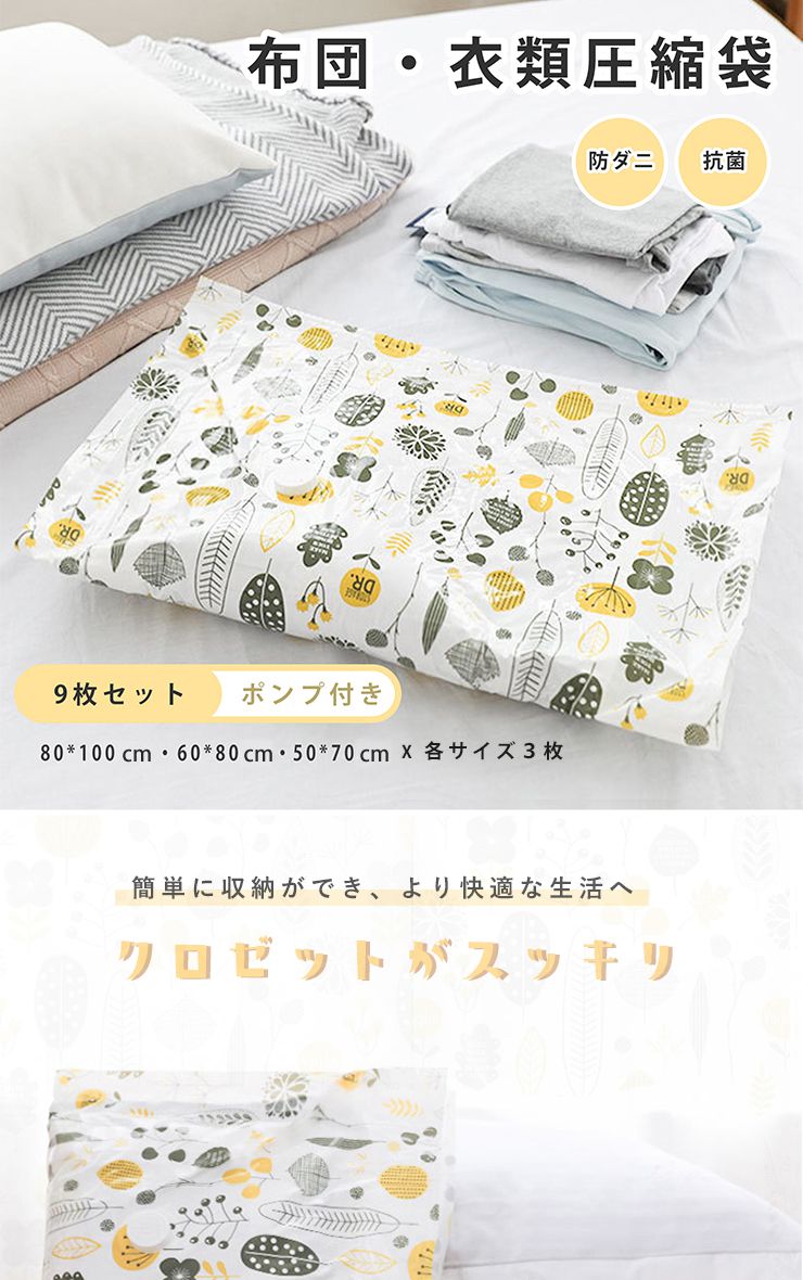 圧縮袋 ふとん 衣類 布団圧縮袋 9枚セット ポンプ付き防ダニ 防塵防湿 カビ 抗菌 100×80cm×3枚&80×60cm×3枚&70×50cm×3枚【送料無料】