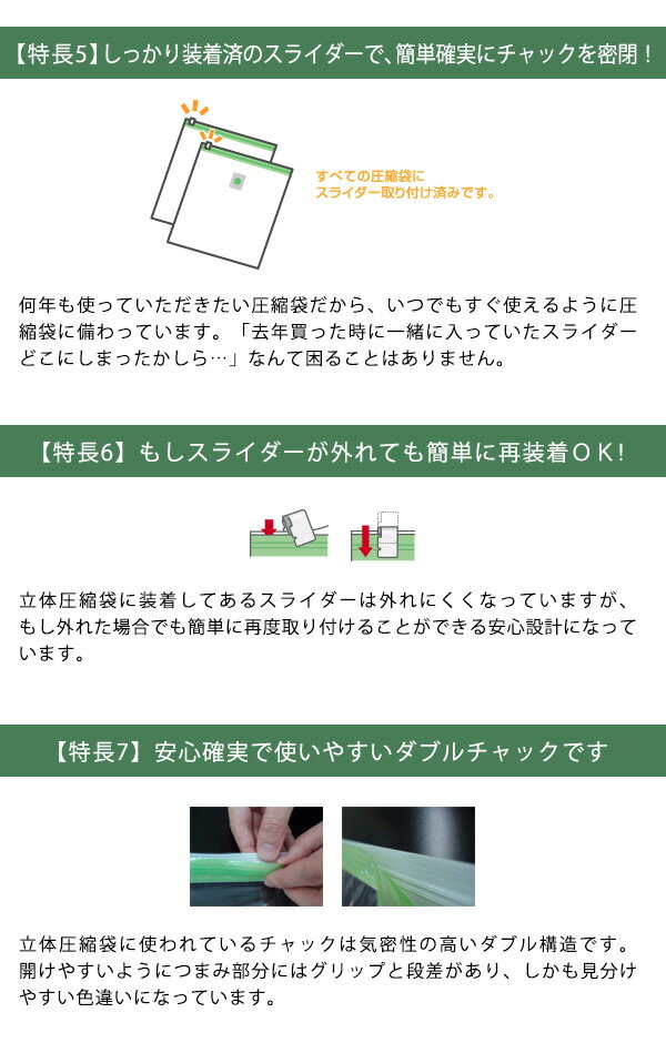【もしスライダーが外れても簡単に再装着OK!】圧縮袋に装着してあるスライダーは外れにくくなっていますが、もし外れてしまった場合でも簡単に再度取り付けることができる安心設計の圧縮袋です。